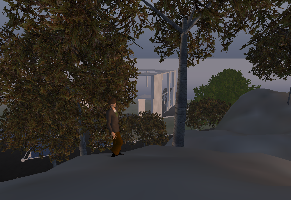 I must admit that this sounds terribly nerdy, but I found myself entertaining myself with an idea of a family sim (i.e. simulator, that is an area in a virtual world or a mini virtual world). I was a bit lazy and didn't start to play with OpenSim configuration files to make it use MySQL instead of the default SQLite, and because the SQLite default does not seem to work out of the box on the latest versions of OpenSim on Mac, I decided that the older 0.6.8 version would do fine at least for the time being. But, in the end after a 60 minutes or so I had a nice home virtual world (VW) running on my home server. Then I could plant some nice trees, load few things there and take a nice snapshot of my new me under a couple of cypresses (in the photo).